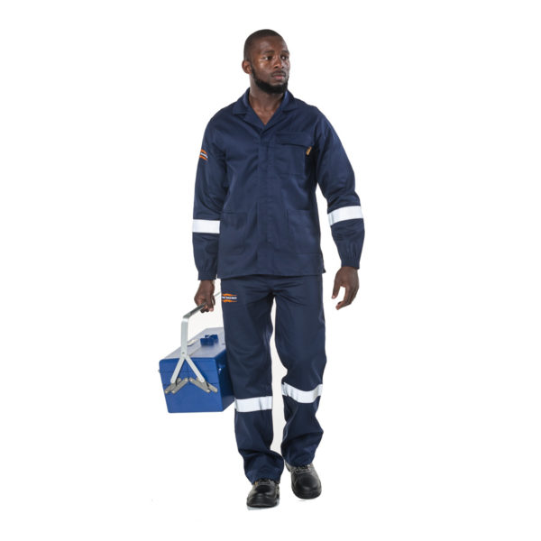 - 50mm silver flame retardant double needle stitched reflective tape on arms & legs